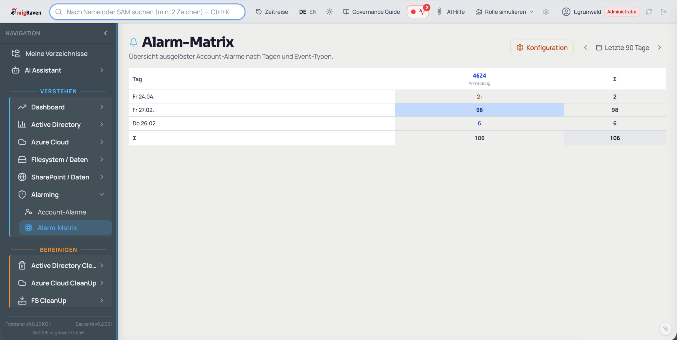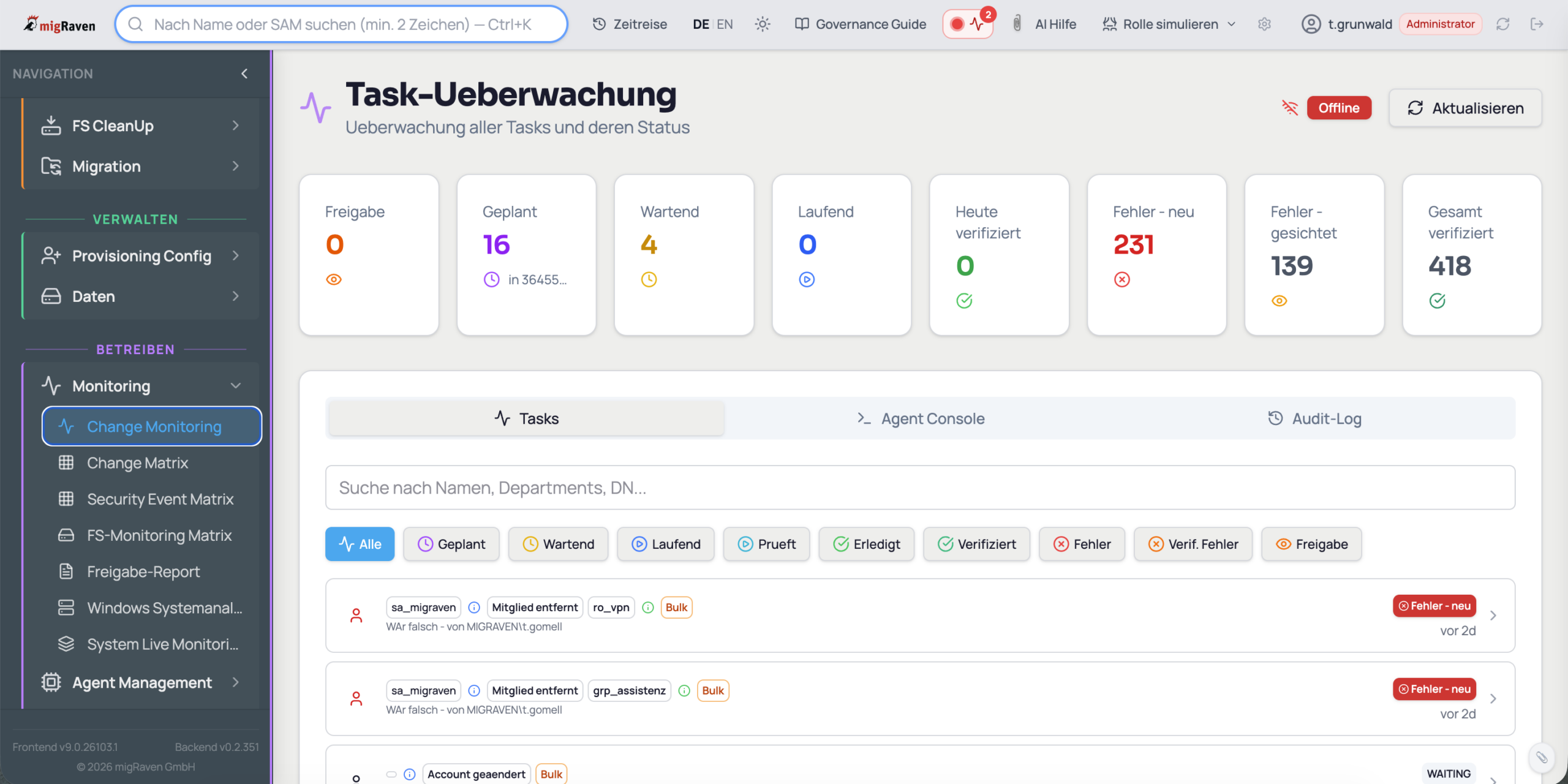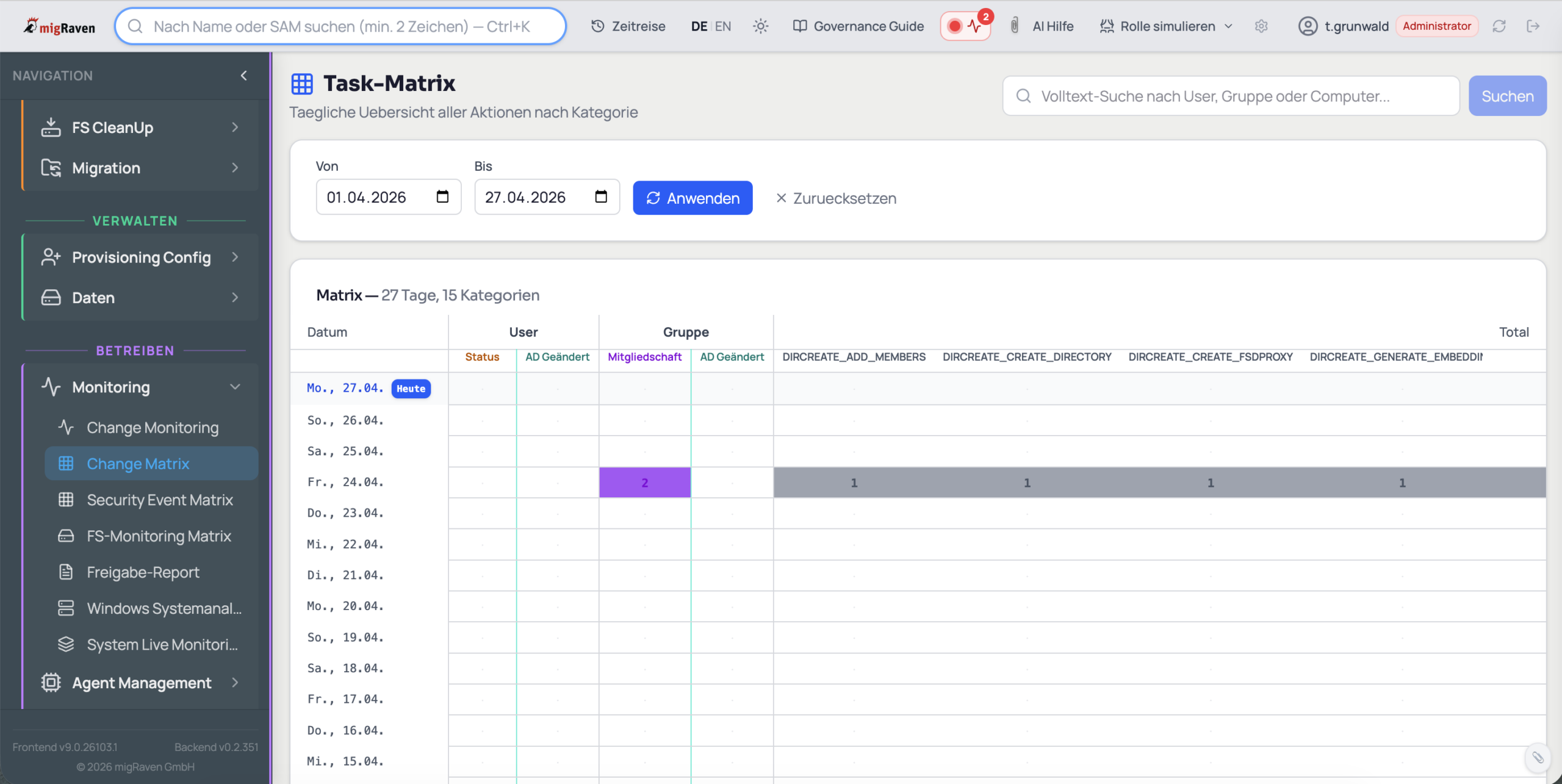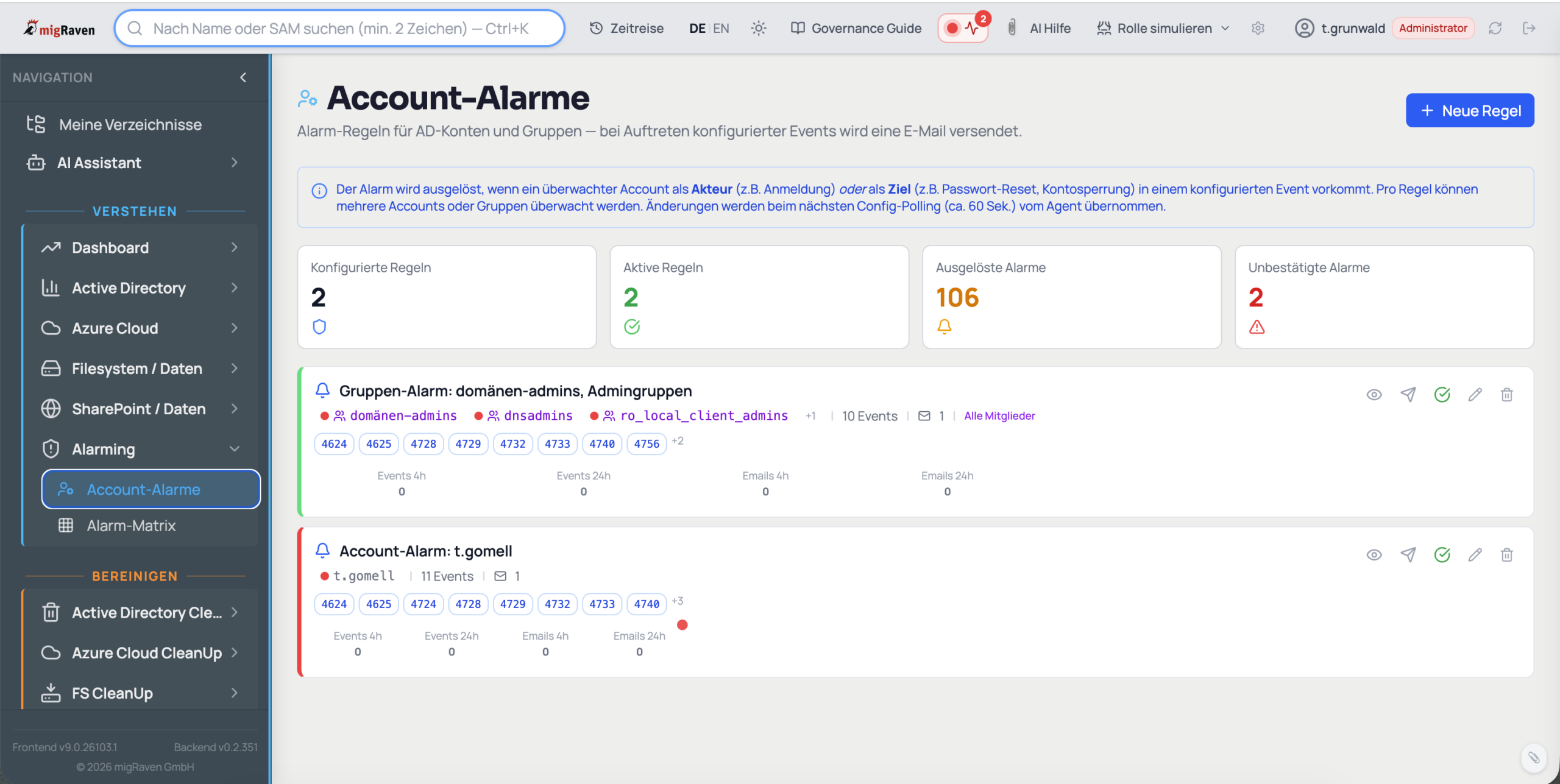 migRaven.MAX überwacht privilegierte Gruppen, Adminrechte und sicherheitskritische Änderungen kontinuierlich und erkennt unautorisierte Rechte-Eskalationen in Echtzeit.