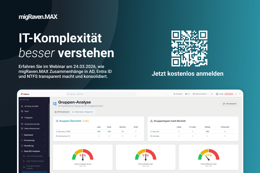Viele IT-Projekte – etwa Fileserver-Migrationen, IAM-Einführungen oder Cloud-Transitionen – scheitern nicht an der Technik, sondern an der fehlenden Übersicht über bestehende Strukturen. migRaven.MAX liefert innerhalb kurzer Zeit einen vollständigen Überblick über: